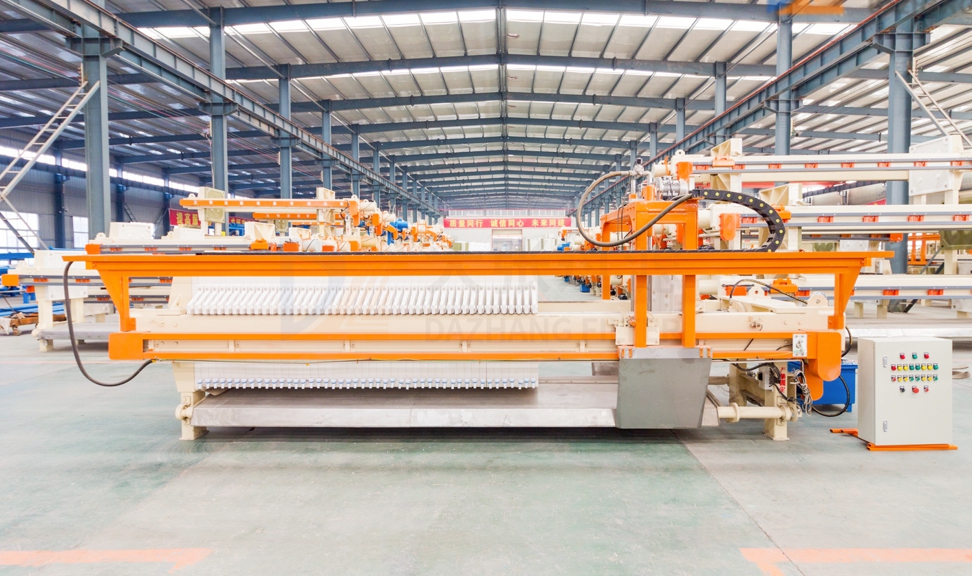 高效節(jié)能壓濾機是在自動拉板壓濾機基礎上增加更換了機械手,加長了油缸,增加了區(qū)間,一次拉開多塊濾板卸料。